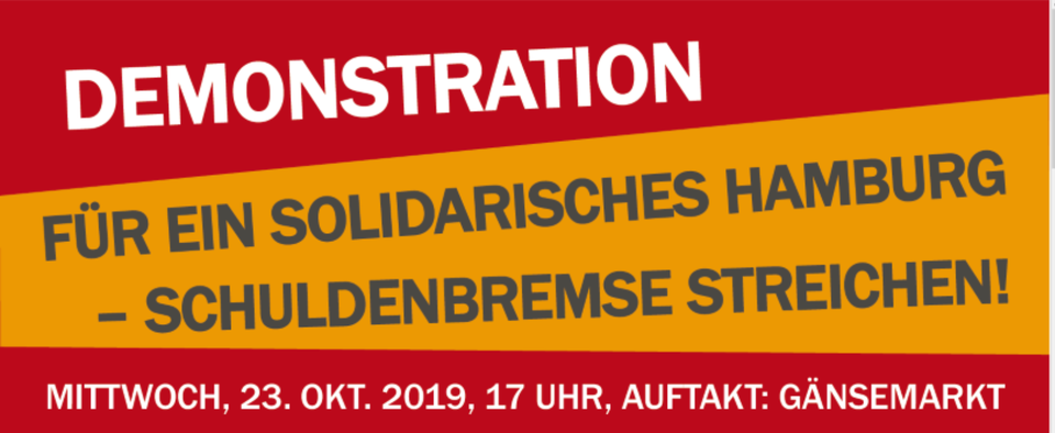 hiermit laden wir euch herzlich zur Demonstration Für ein solidarisches Hamburg – Schuldenbremse streichen! ein, am Mittwoch, den 23.10.2019, um 17:00 Uhr auf dem Gänsemarkt.