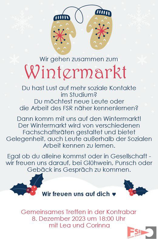 hiermit laden wir euch zu gemeinsamem Teilnahme am Wintermarkt ein, am Freitag, den 08.12.2023, ab 18 Uhr in der Kontrabar (Alexanderstraße 1, Raum 0.15)!