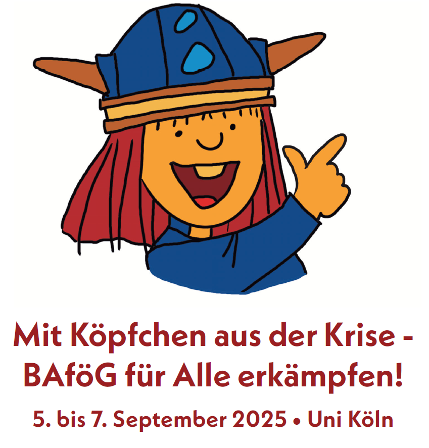 hiermit laden wir euch herzlich zum Kongress Mit Köpfchen aus der Krise – BAföG für Alle erkämpfen! ein, vom 05.09. bis 07.09.2025 an der Uni Köln.