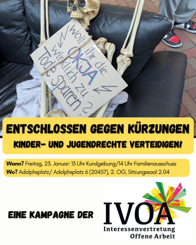hiermit laden wir euch herzlich zur KundgebungEntschlossen gegen Kürzungen – Kinder- und Jugendrechte verteidigen!der Interessenvertretung Offene Arbeit (IVOA) ein, am Freitag den 12.12.2025 um 13 Uhr vor dem Adolphsplatz 6.